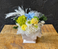 クリアボックスサイズ 約 H25㎝×W18㎝×D18㎝ 白、グリーン、黄色、水色のプリザーブドフラワーを、溢れ出すように贅沢にアレンジしました。 涼し気で品のあるプリザーブドフラワーアレンジメントです。 プリザーブドフラワーは、生花と違い水やりをしなくても枯れずに長く楽しむことができるのが魅力です。 贈る方が花瓶を持っていなかったりお手入れの心配がある場合や、記念に残る特別なギフトをお探しの方に人気のお花です。 クリアボックスに入った状態でお届けいたします。 プリザーブドフラワーとは… 生花を特殊な液につけて水分と色を抜き新たに染色し、お手入れなしに枯れずに長期間楽しめるように加工した花です。 「Preserved」とは「保存されている」という意味で、乾燥させただけのドライフラワーとは異なり生花のようなみずみずしい美しさが保たれています。 ※プリザーブドフラワーは生花ではございませんので水やりの必要はありません。 高温多湿を避けてお飾りください。 ※商品の色・形態は、多少写真と異なる場合がございます。