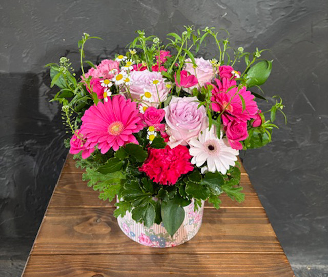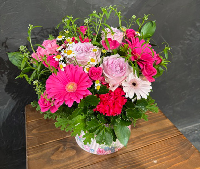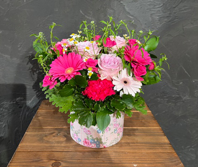 【5/6-10到着・母の日ギフト】リバティプリントサークルBOX・フラワーアレンジメント《ピンク濃淡系》※日付指定・時間帯指定不可