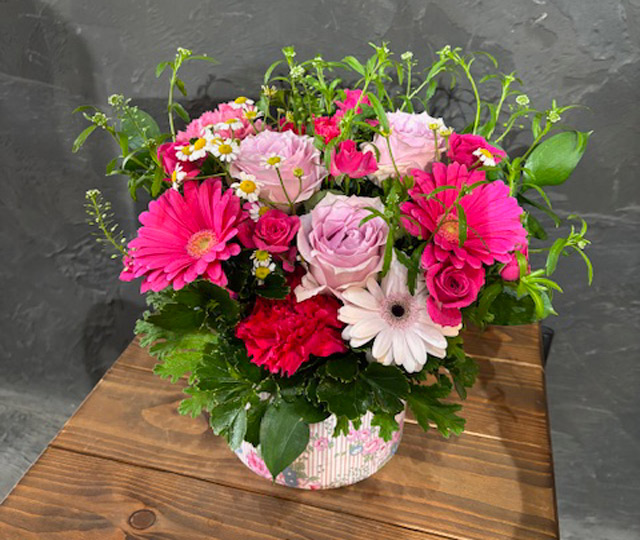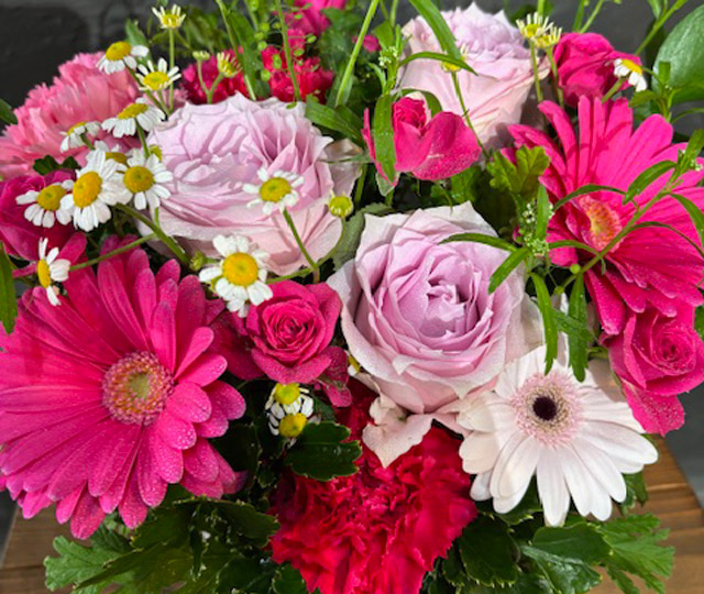 カーネーション、バラ、ガーベラをメインに使用しています。
